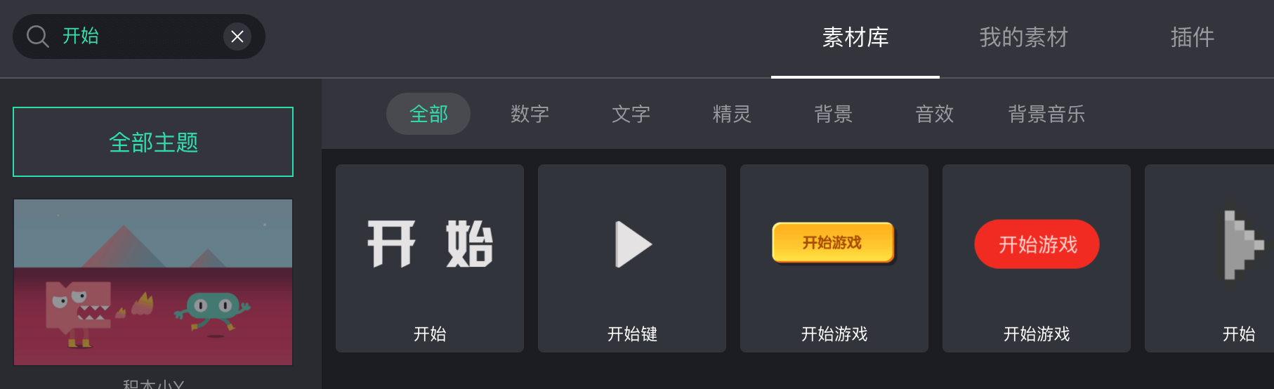目前示例所用的素材都能在素材库里找到,添加时可以在左上角进行搜索,选择全部主题,然后输入你要搜索的内容,也可以直接浏览查找