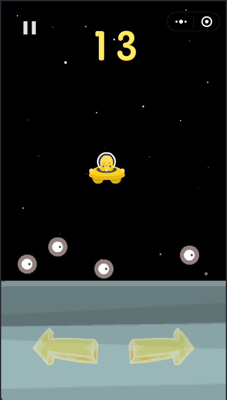 我们可以先选择一个符合自己主题的背景,例如示例中的星空背景,主角是坐在飞船上的太空人,敌人是眼球怪物,这些示例素材是风格不完整的,我们建议开发者自己使用风格统一的素材,可以参考最上方的完整版踩一踩