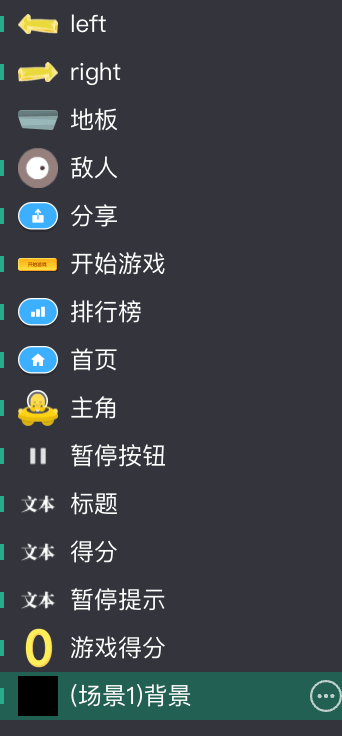 我们需要的主要素材有【主角/敌人/地板】,还有其他 UI 素材【开始/暂停/继续/排行榜/首页/分享/左右按键】等按钮