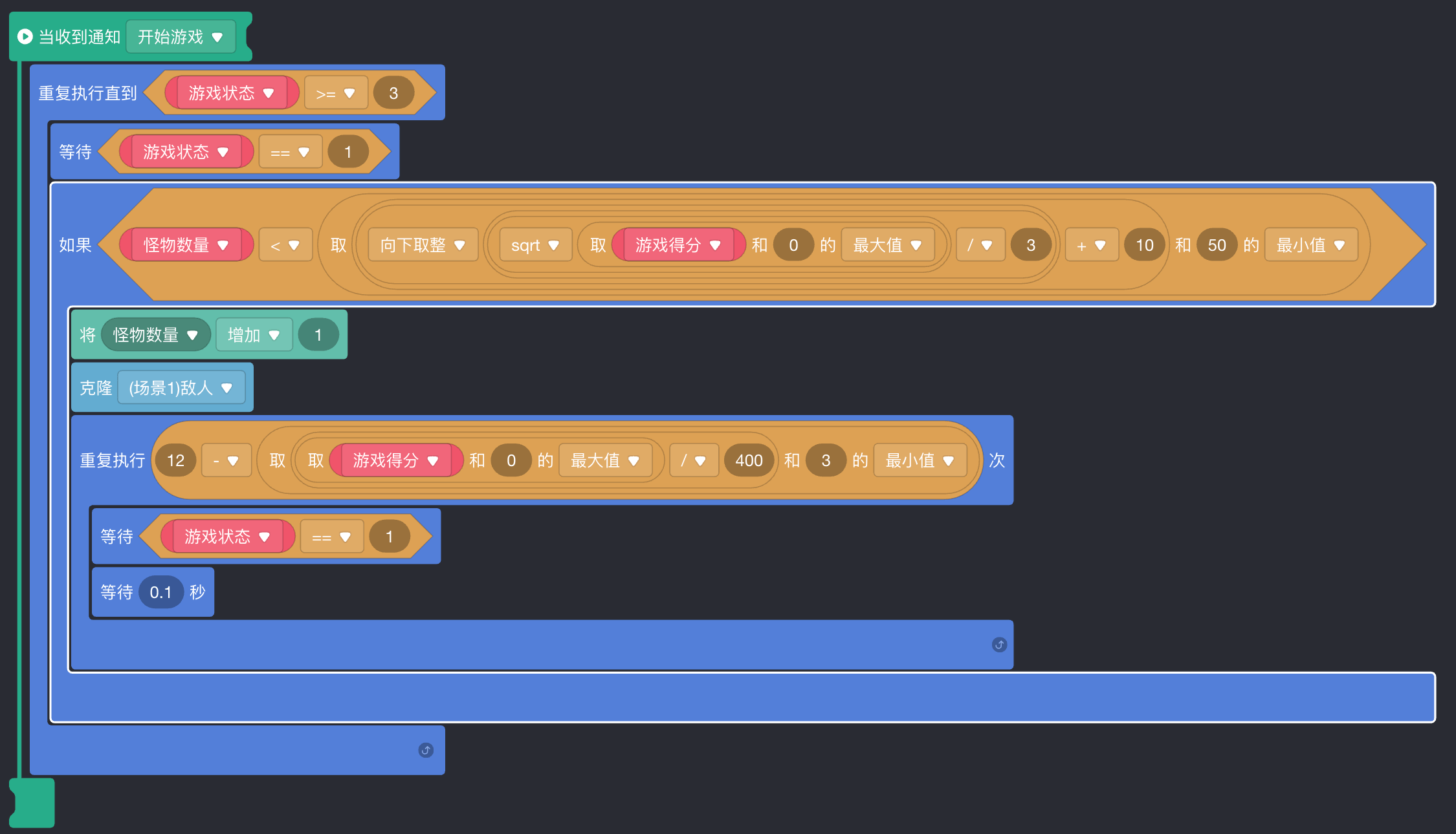 新建一个全局变量【怪物数量】,每次克隆敌人时都会增加一个怪物,当怪物被消灭时就会减少,在创建时检查怪物数量是否达到当前峰值才进行创建