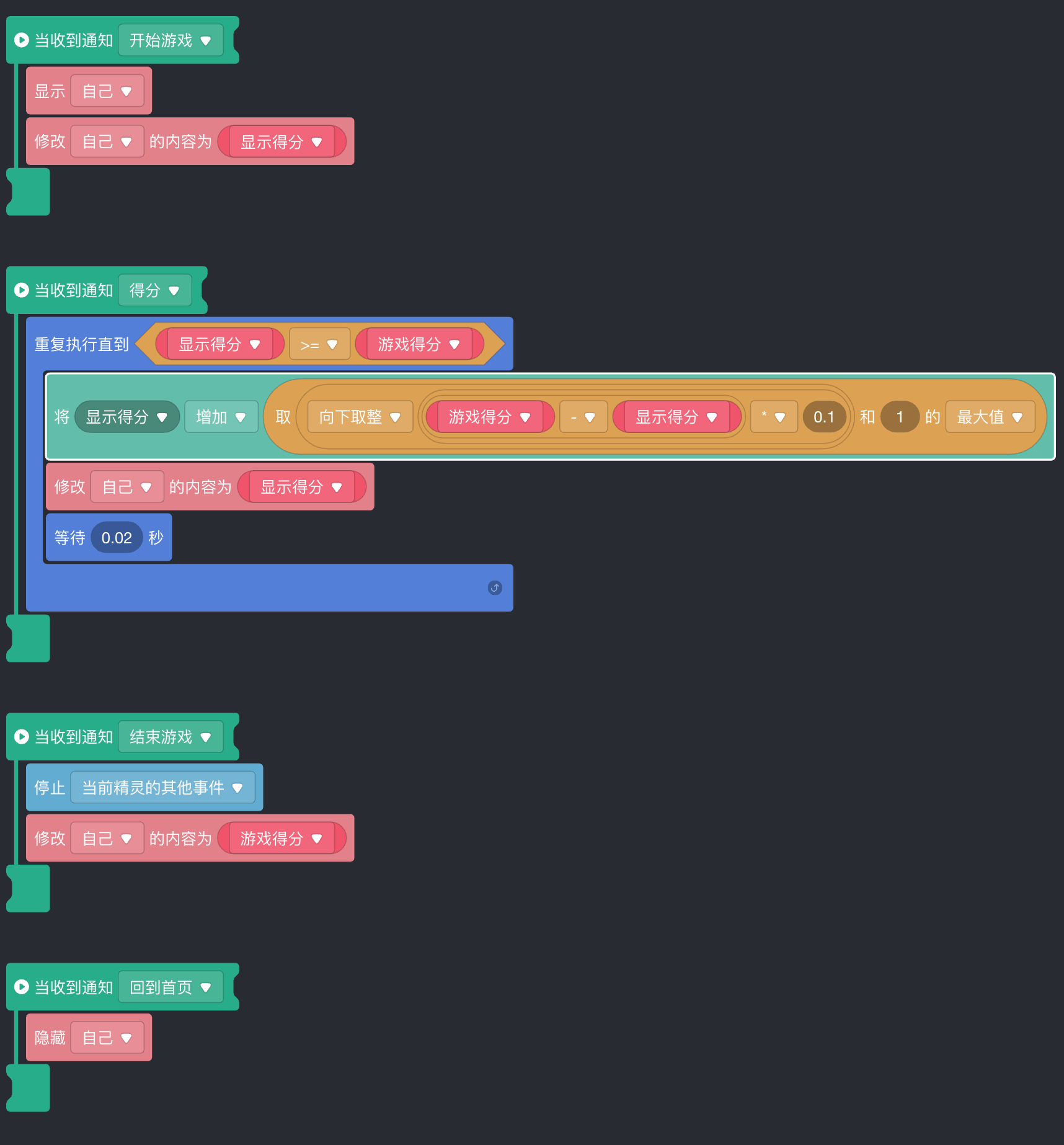 具体做法:创建 2 个得分,一个游戏真实得分,一个展示得分,当玩家得分时,将游戏真实得分增加后,通过通知来修改显示得分,显示得分循环增加自己与真实得分的差值之间的 10%,从而做到缓慢增加的效果