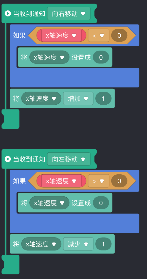 左右控制思路:通过发送左右操作通知,当主角接收到通知时,改变主角的【x 轴速度】,当【x 轴速度】为负时,主角向左移动,为正时向右移动