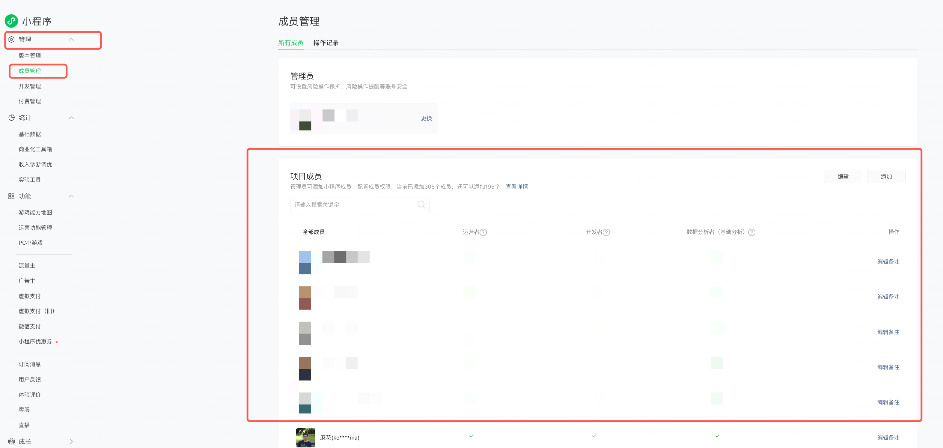 项目成员:表示参与小程序开发、运营的成员,可登陆小程序管理后台,包括运营者、开发者及数据分析者。管理员可在“成员管理”中添加、删除项目成员,并设置项目成员的角色。