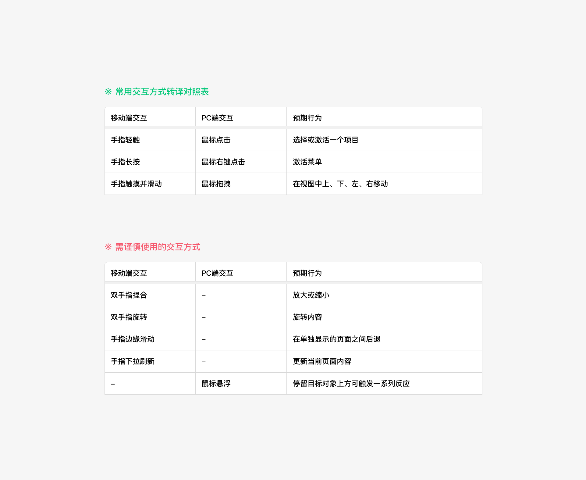 移动端、PC端均有其独特的交互方式,在适配过程中可以参照以下转译方法。