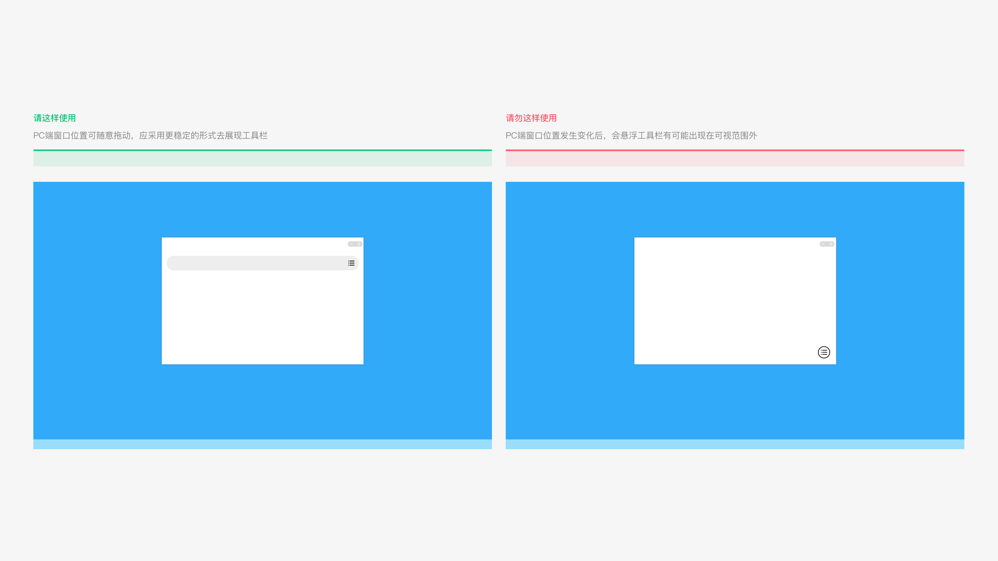 悬浮工具栏可能会因视窗的位置的变动而出现在可视范围外,在PC端适配中,如果工具栏与特定区域相关,建议采用更稳定的形式去呈现。