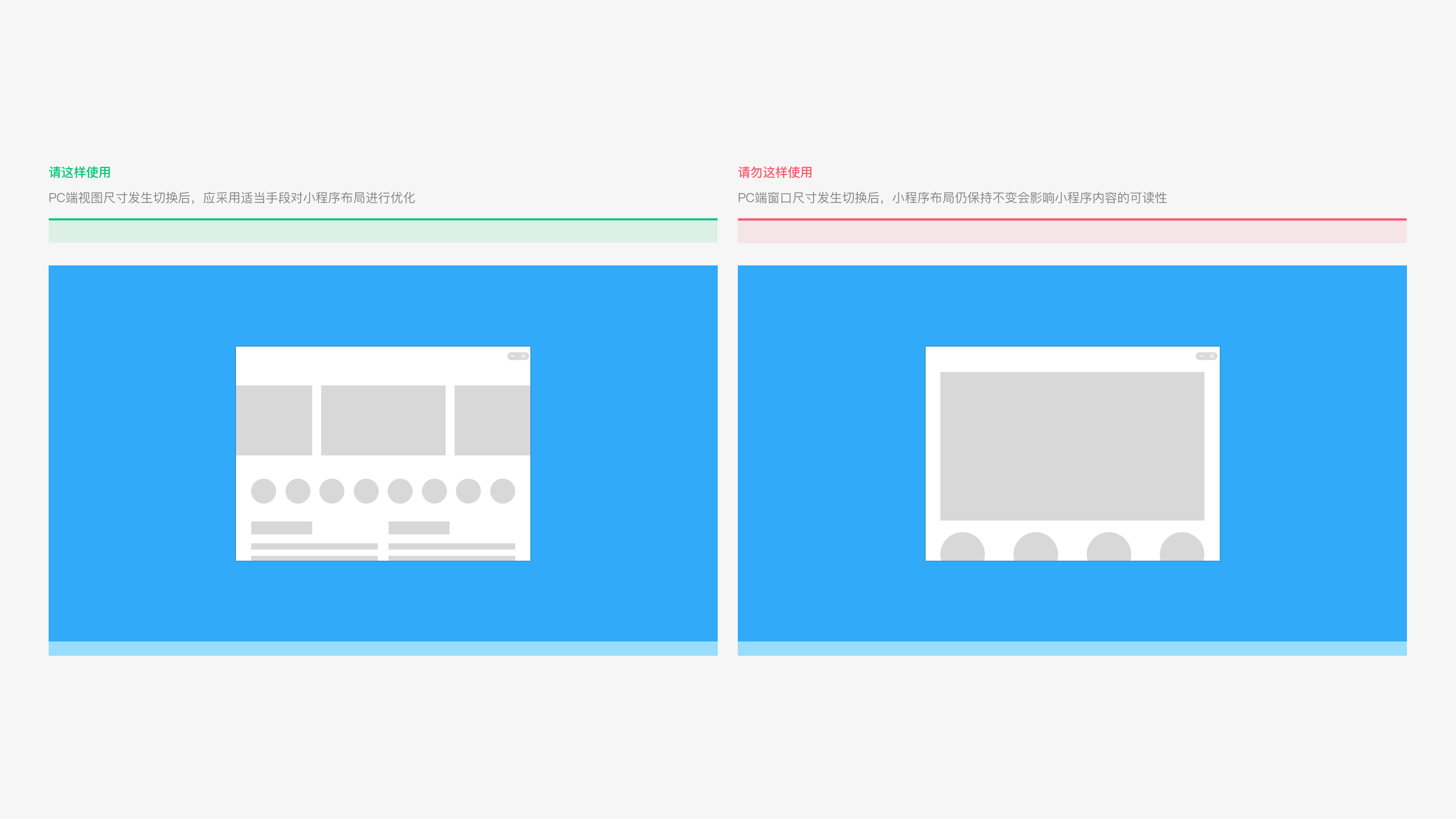 由于用户可在PC端使用小程序,且有可能在不同尺寸视图下进行切换,为了保证小程序在不同尺寸屏幕下的体验流畅友好,我们建议开发者根据用户使用设备和场景,自行对小程序进行适配。适配推荐栅格系统、配合响应策略实现页面动态布局。