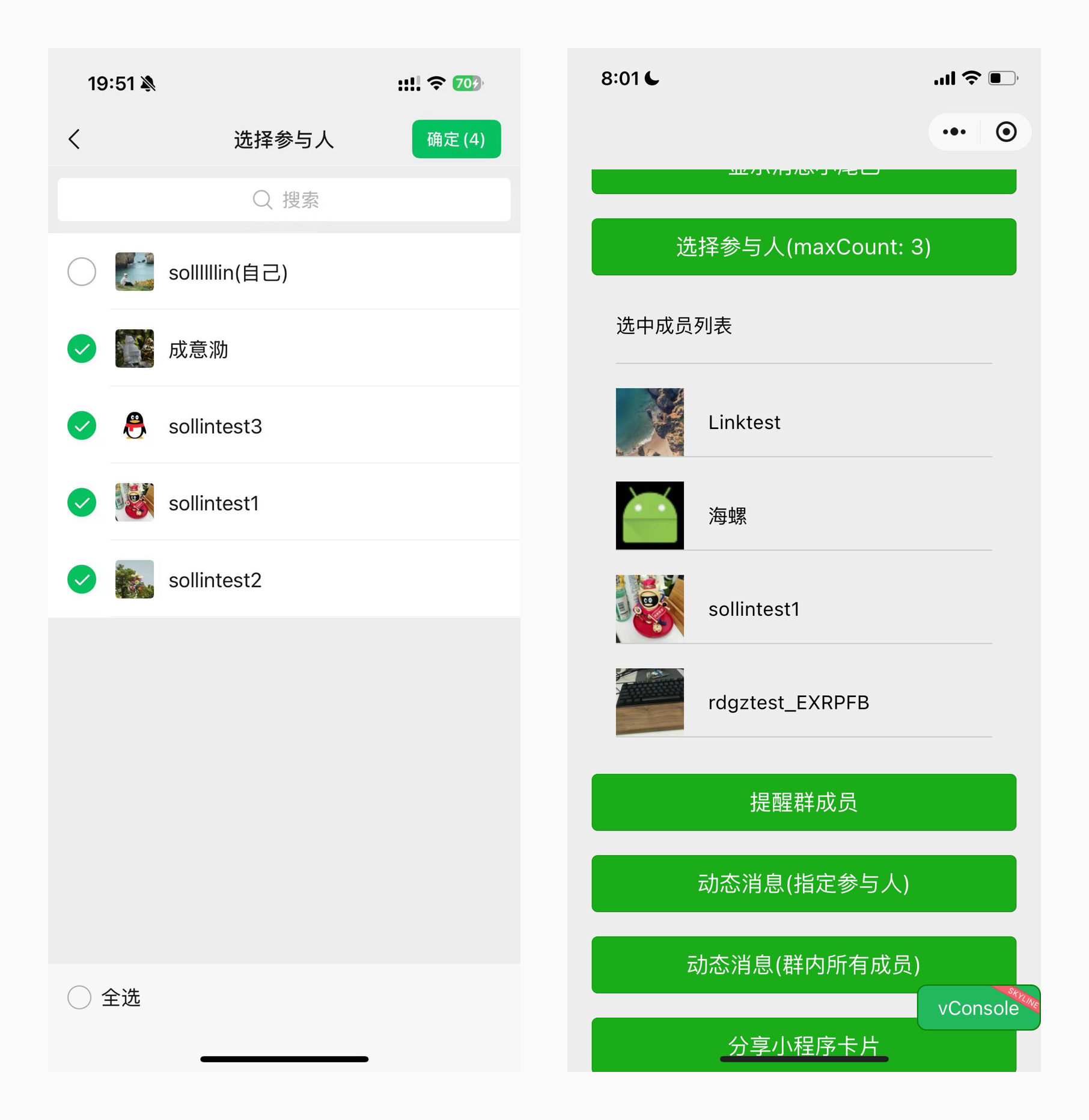 | 聊天成员相关能力 | 开发者可调用聊天成员选择器并获取成员相关id,通过open-data渲染聊天成员的头像昵称 | ![]() |