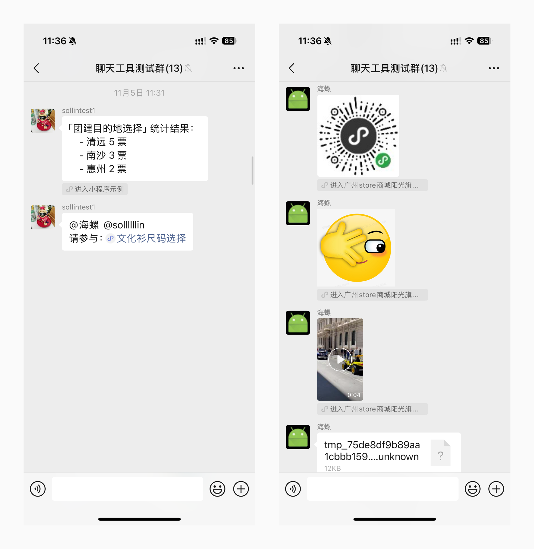 | 发送内容到聊天能力 | 开发者可发送文本、提醒、图片、表情、视频等内容类型到聊天中 | ![]() |