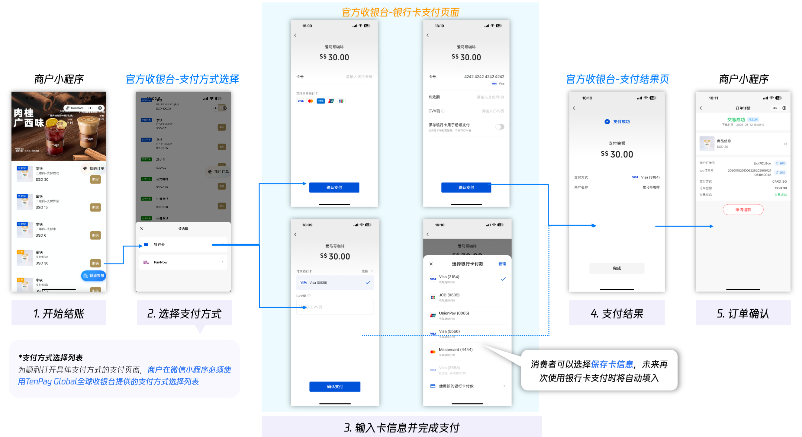 接入全球收银台提供的银行卡支付功能,消费者在商户小程序进行购买时,能够通过输入银行卡三要素信息并进行安全验证,向商户完成付款