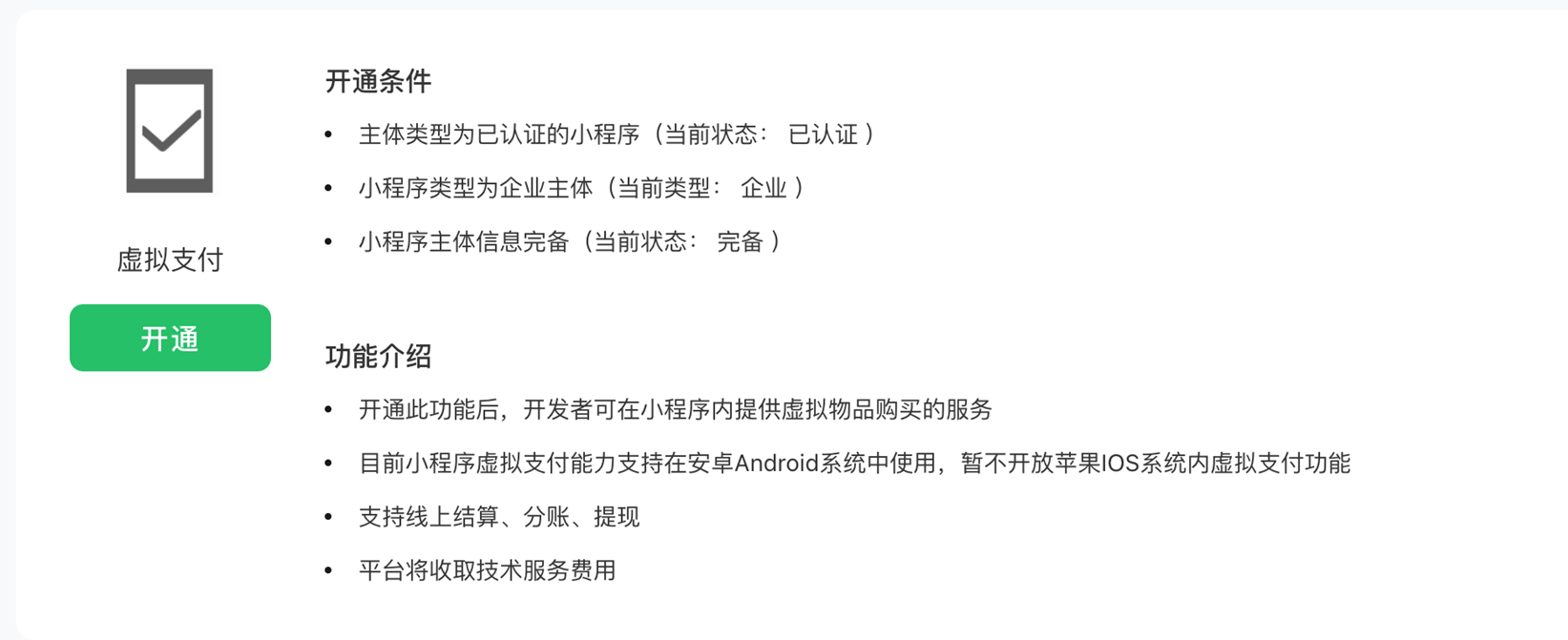 当小程序完成资质申请后,点击mp左边栏【虚拟支付】即可前往开通页面进行开通。