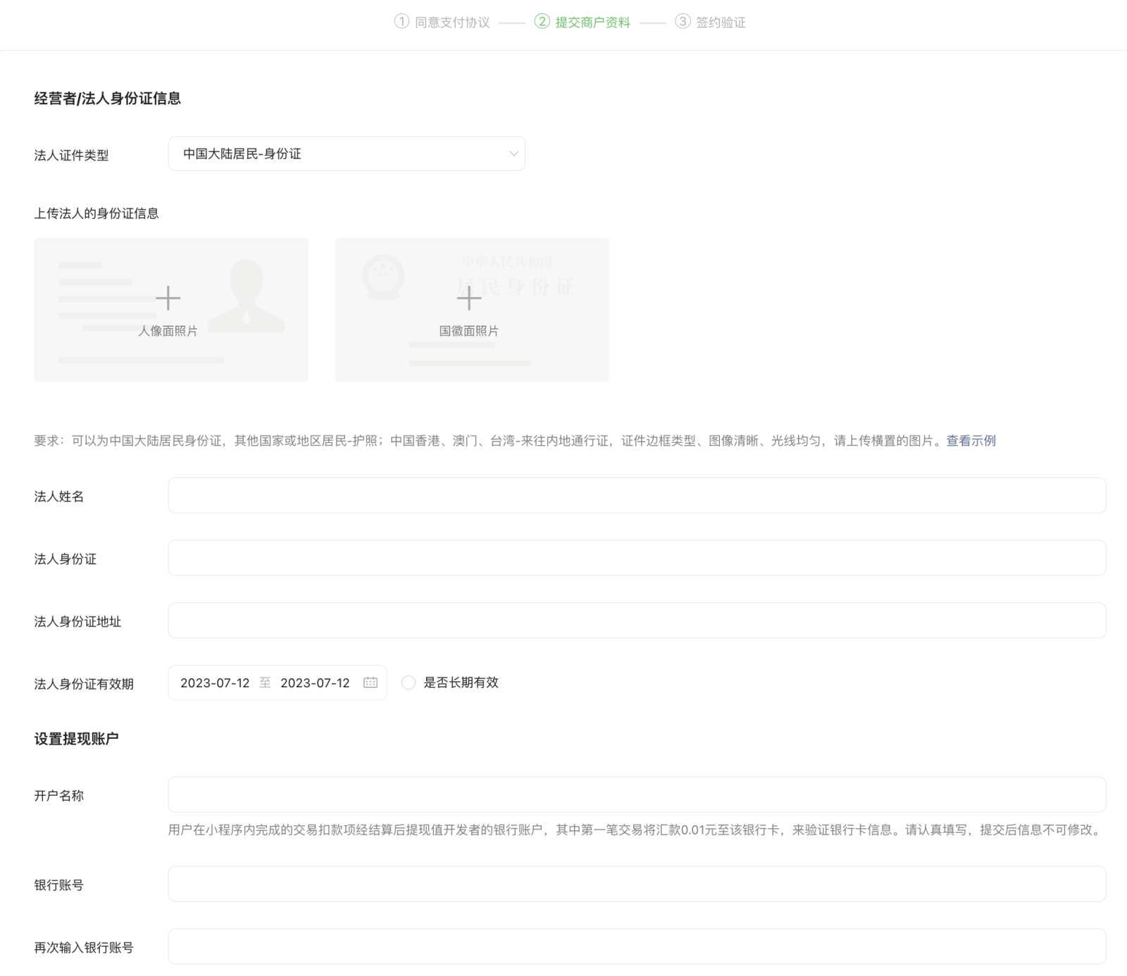 若当前账户满足开通条件后,点击【开通】按钮进行协议签署及资料上传,开通新的商户号。