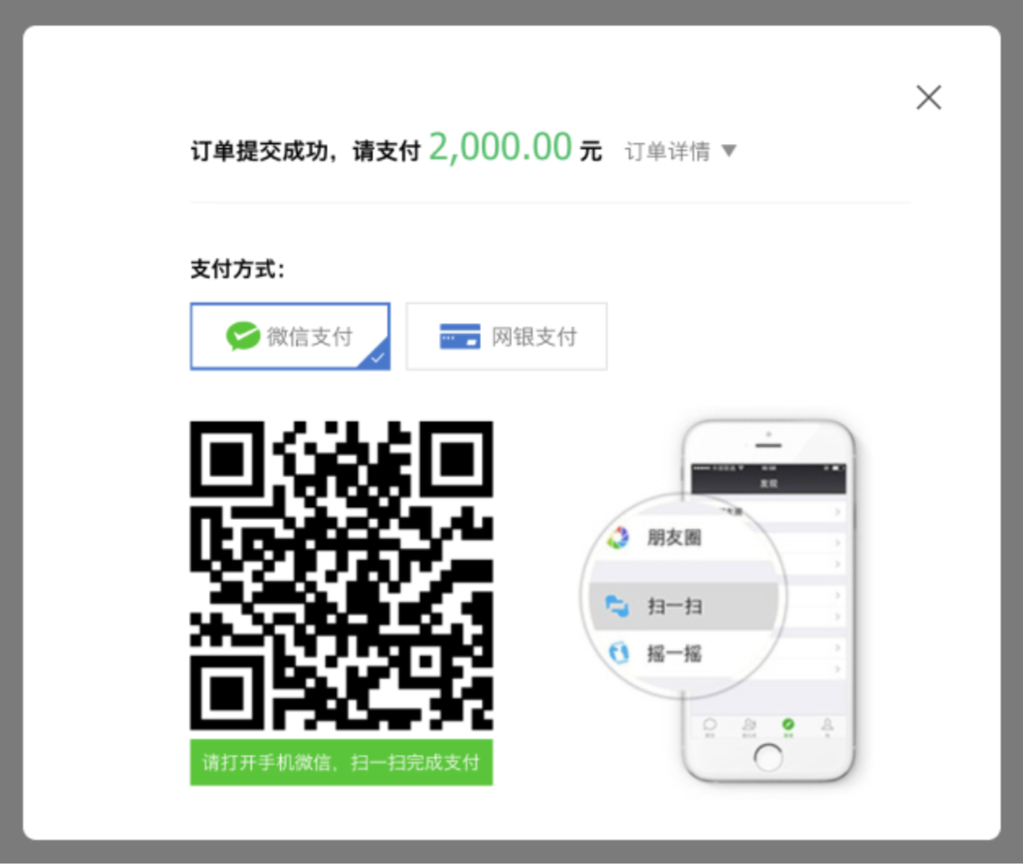 - 3.点击【支付】,完成付款。支持微信支付和网银支付两种方式,如需对公账户付款,可以使用网银支付方式。后续将支持线下打款等更多付款方式。