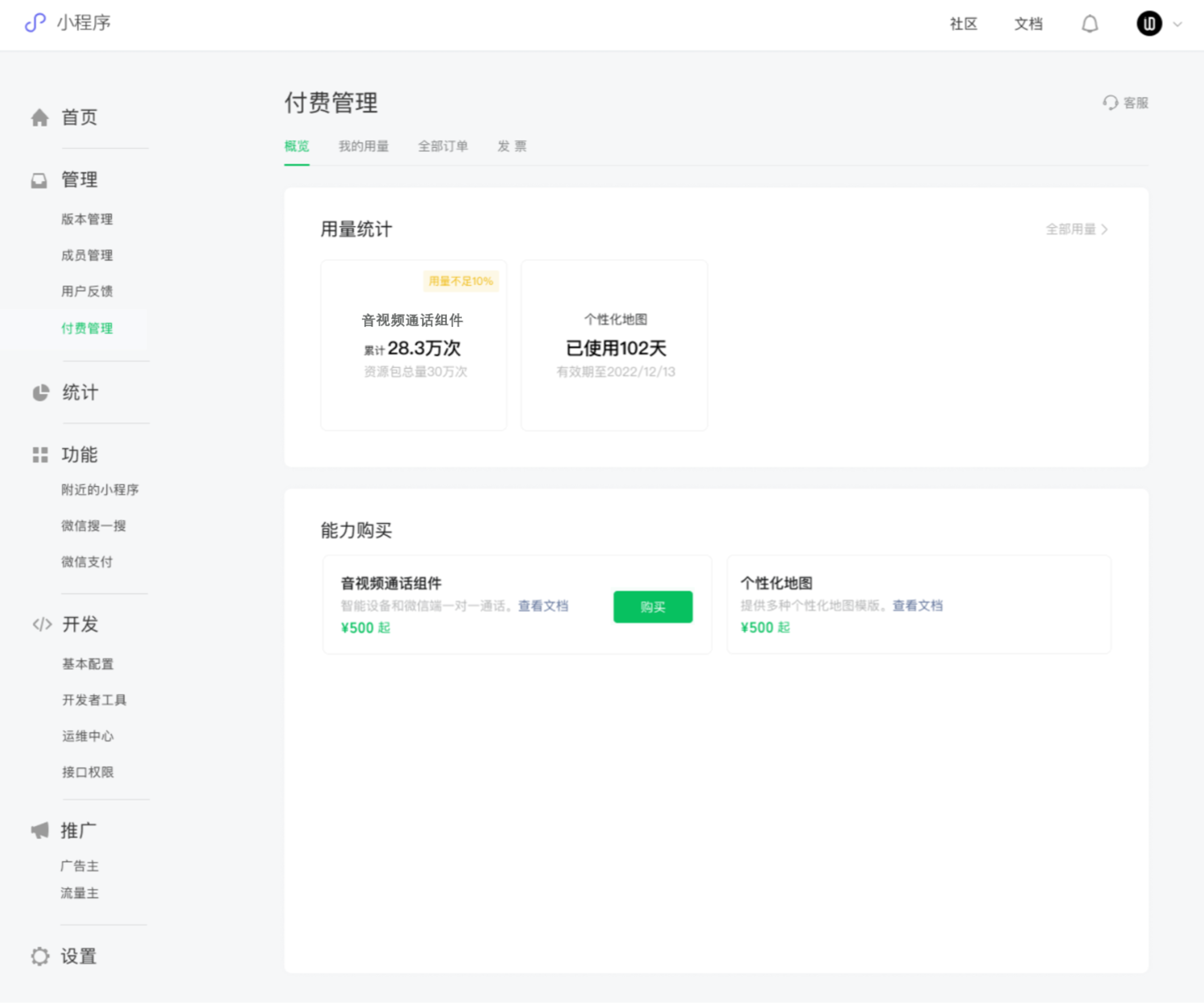 付费管理模块,承载开发者在小程序里购买各项付费能力,管理订单和用量,开具发票的功能。