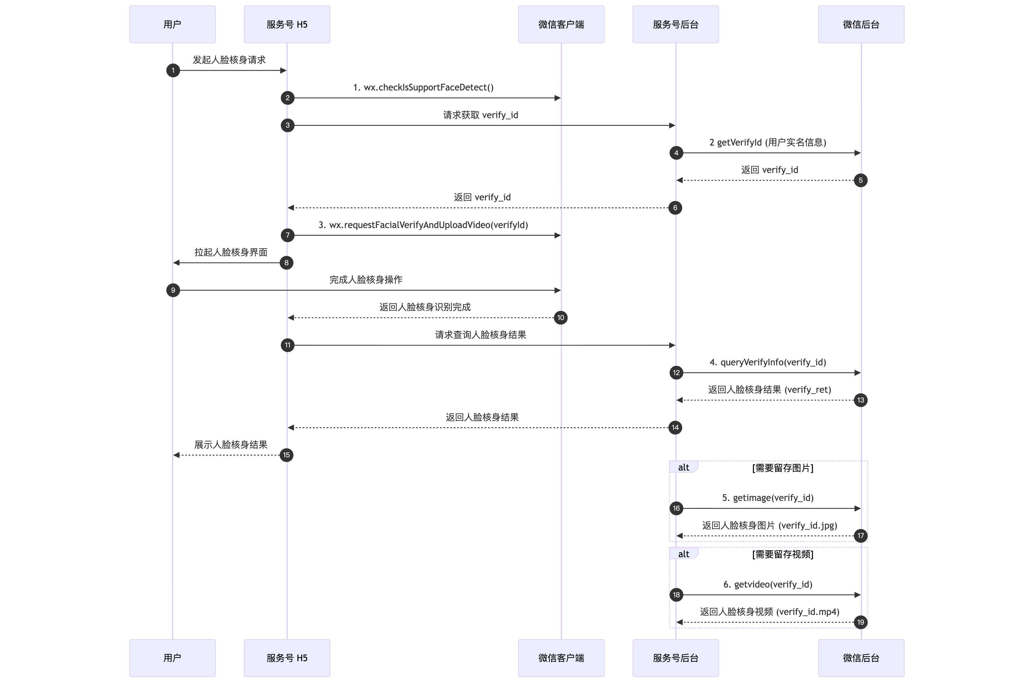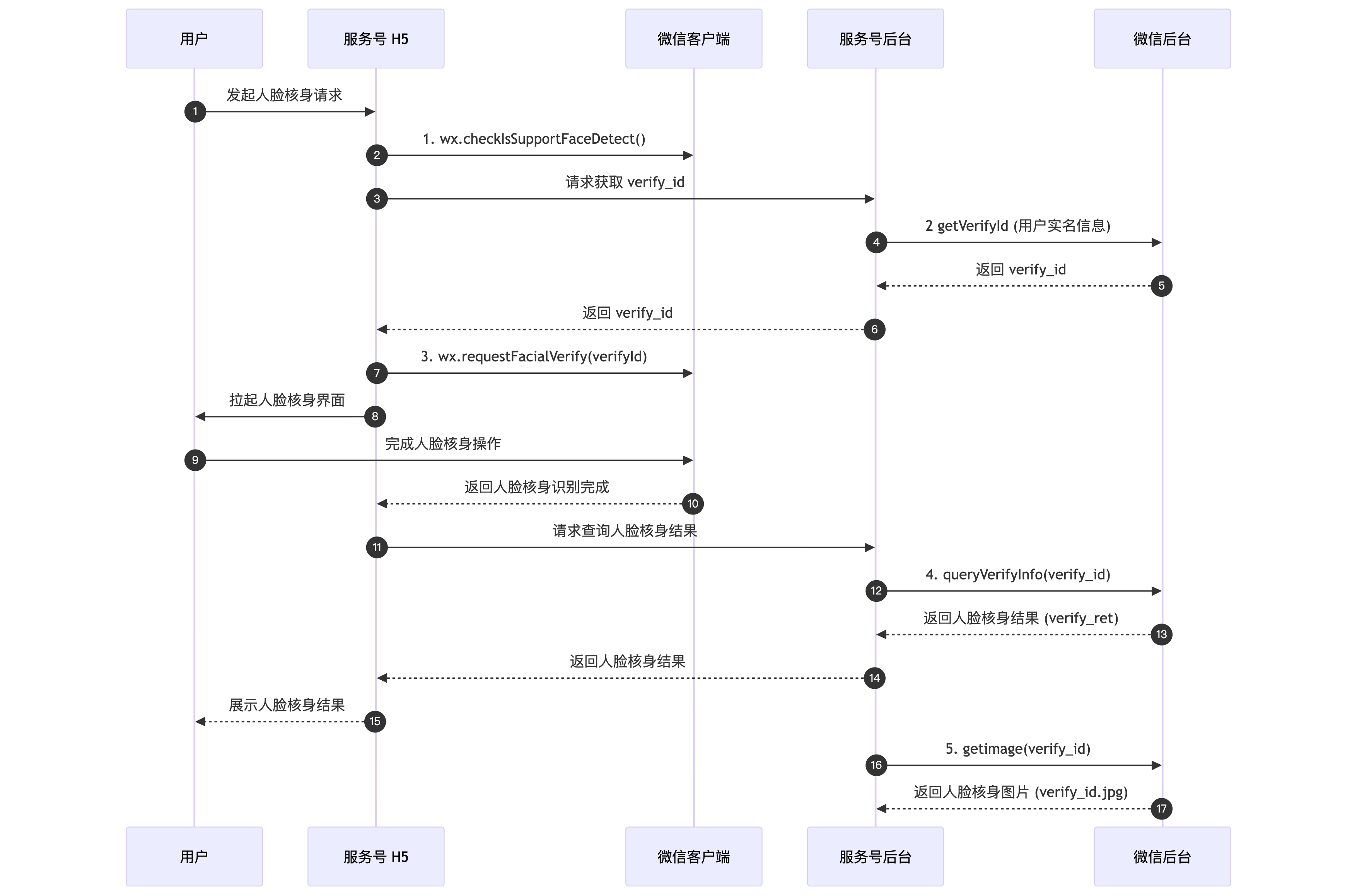 服务号后台需要根据「用户实名信息(姓名+身份证)」调用微信后台 getVerifyId 接口获取人脸核身会话唯一标识 verifyId 字段,然后给到服务号前端调用 wx.requestFacialVerify 接口使用。