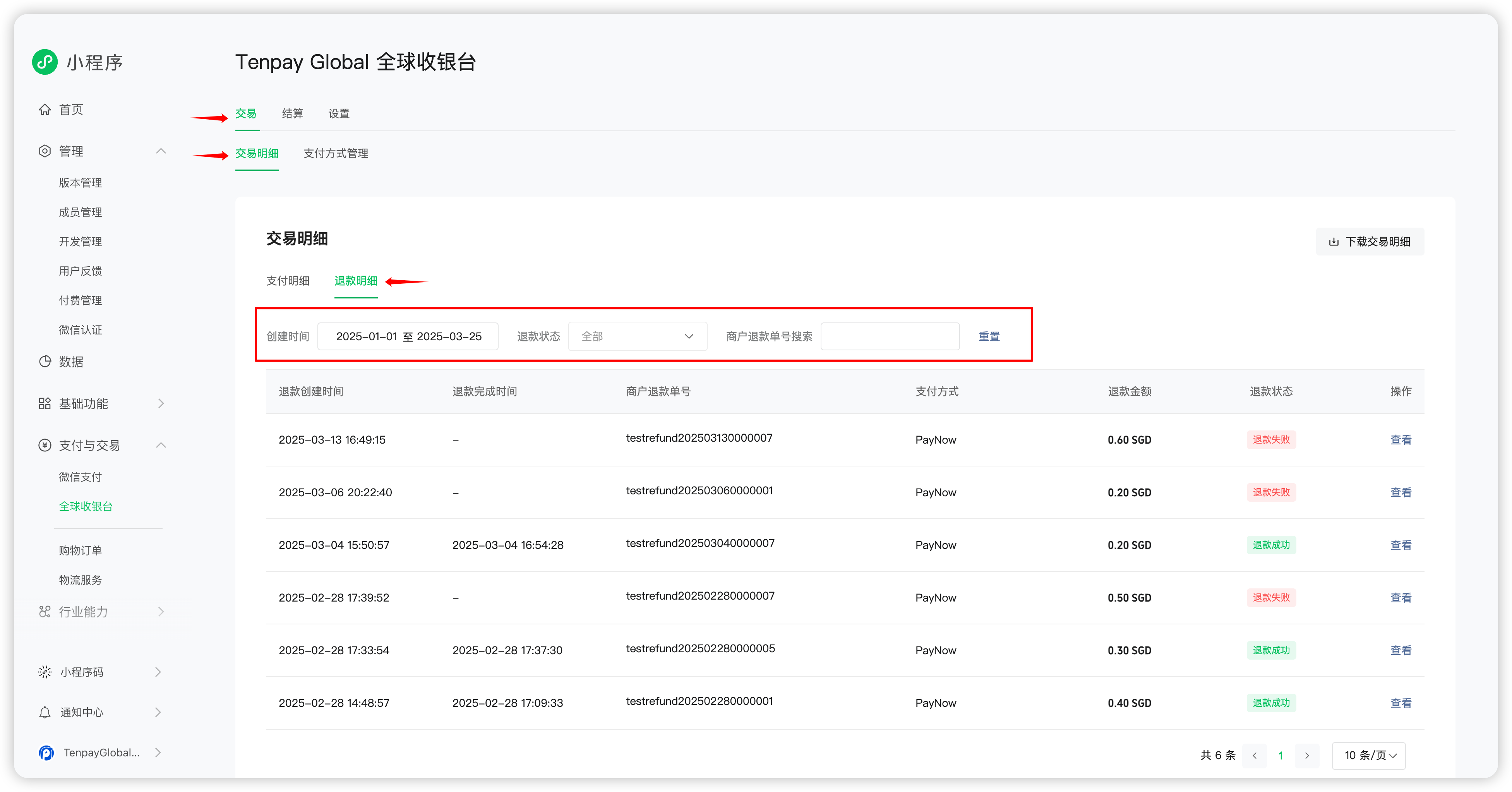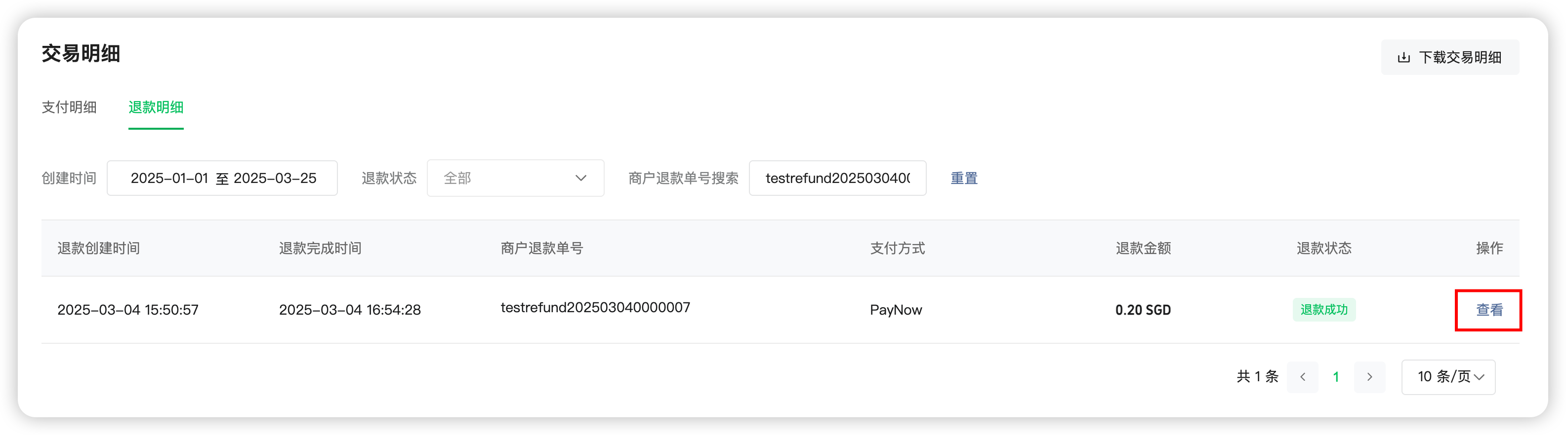 Filter refunds by “Creation Time” or “Refund Status”, or search directly using the “Merchant Refund Number” to locate the desired refund record.