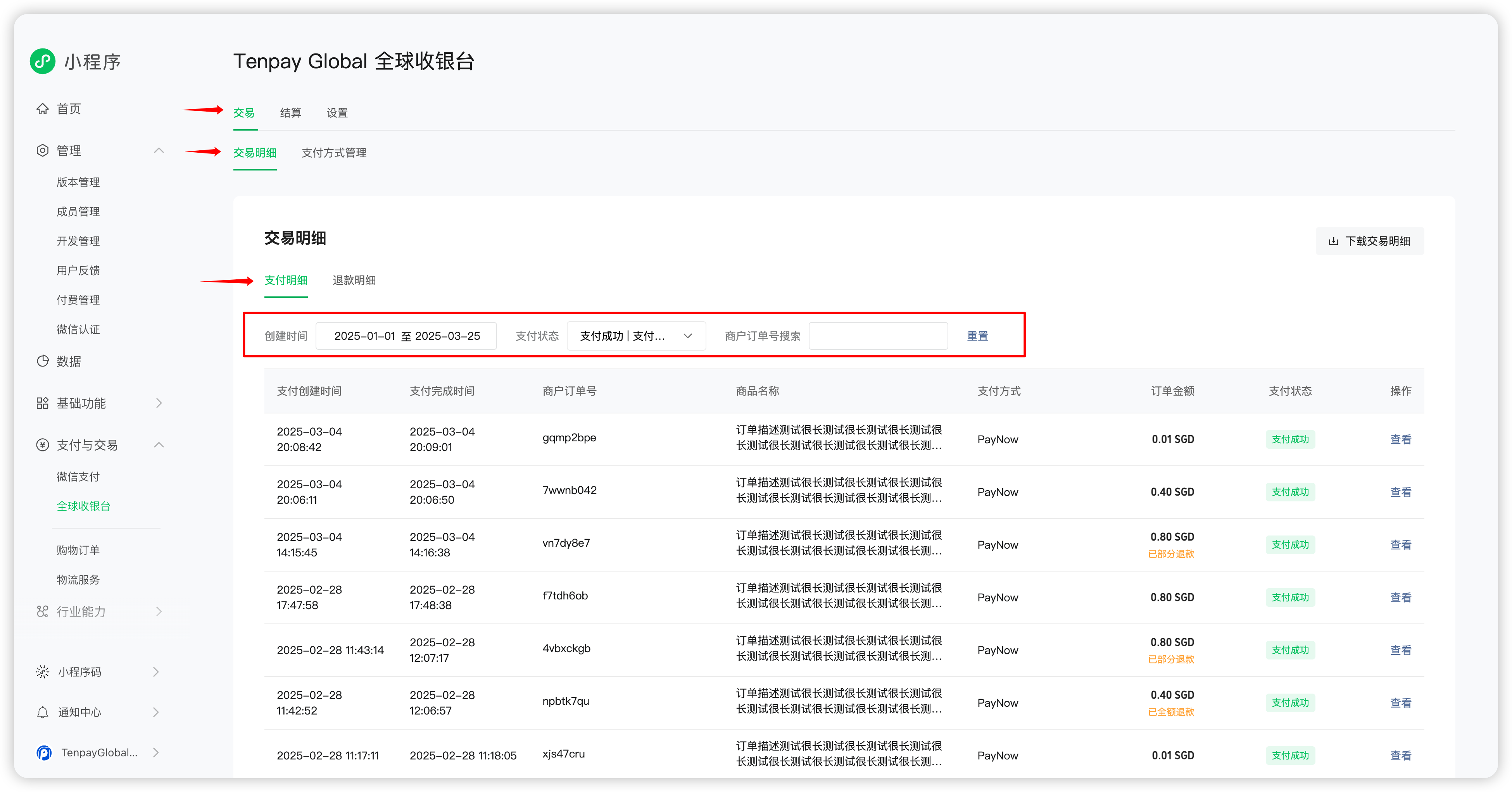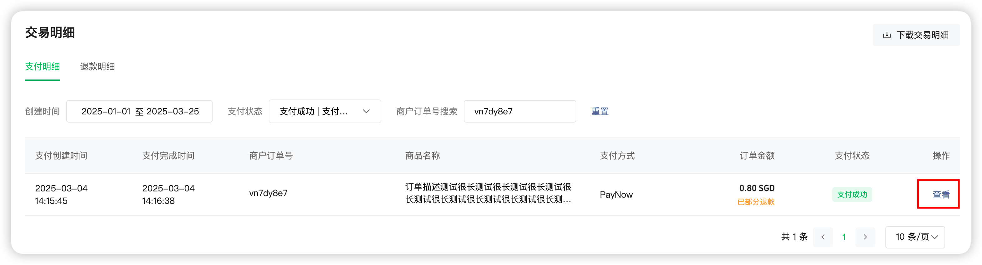 Filter payment orders by “Creation Time” or “Payment Status”, or search directly using the “Merchant Order Number” to locate the desired payment order.