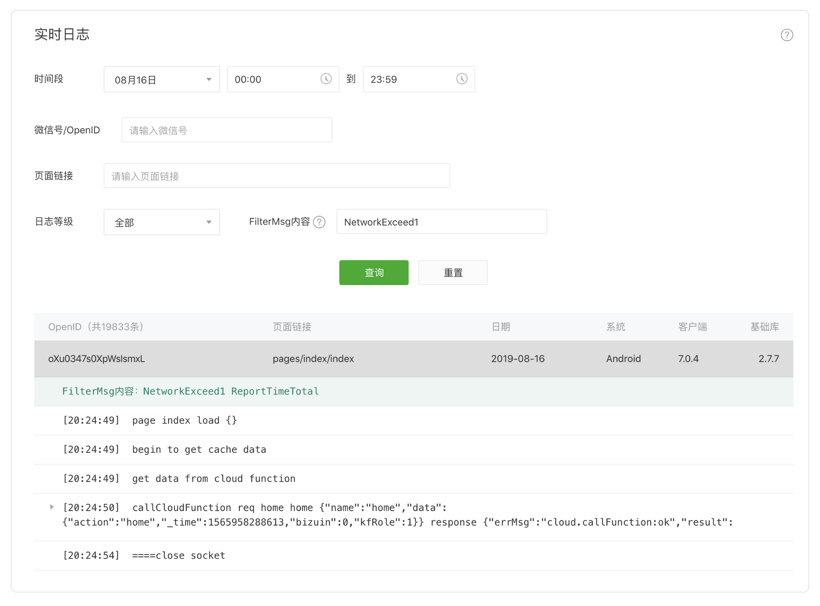 登录小程序管理后台,从“开发->运维中心->实时日志”进入日志查询页面。开发者可通过设置时间、微信号/OpenID、页面链接、FilterMsg内容(基础库2.7.3及以上支持setFilterMsg)等筛选条件查询指定用户的日志信息。