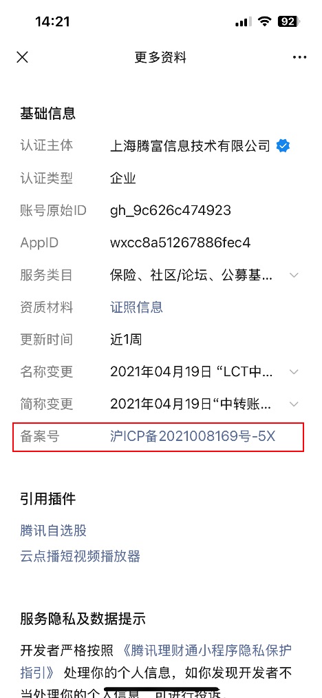 - 获得的备案号可在小程序“更多资料”页内查询。