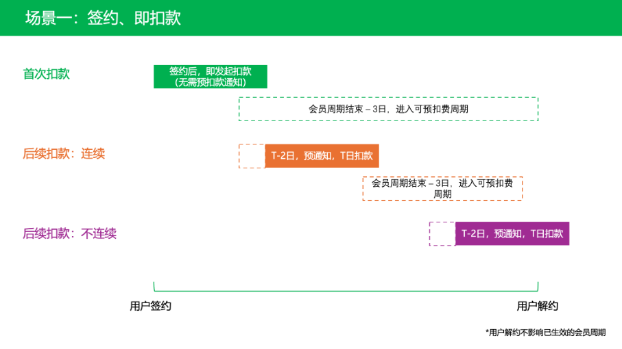 | 扣费日期 | 商户在t-2日向用户发送了预扣费通知,t日可扣费 |