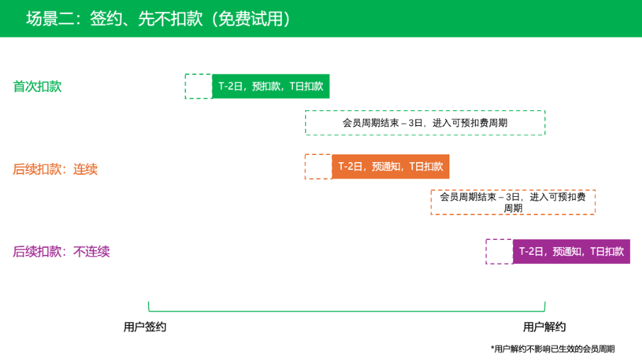 用户先免费试用,后续再发起扣费,每次扣款、均需在t-2日向用户发送预扣费通知