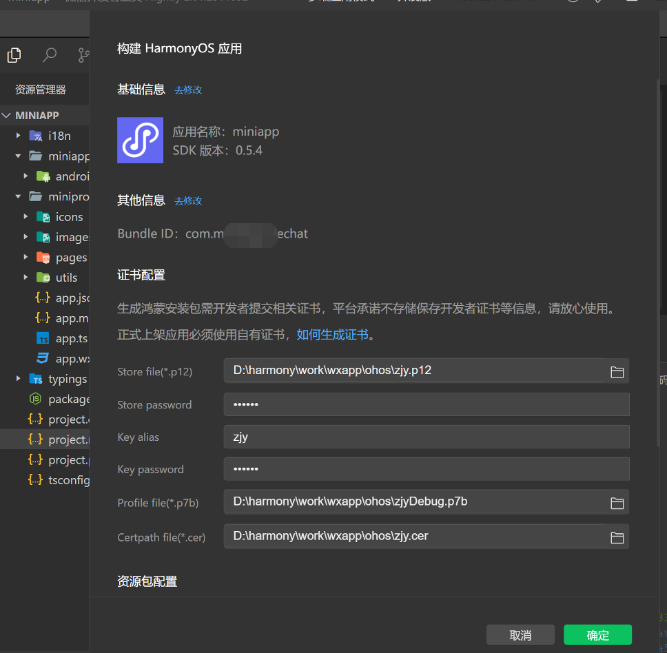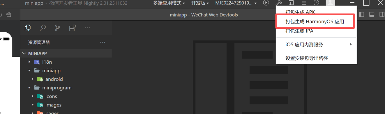 前往「微信开发者工具」工具栏,点击「构建 - HarmonyOS 应用」,进入构建面板中完成相关配置,点击确定后即可生成 app。