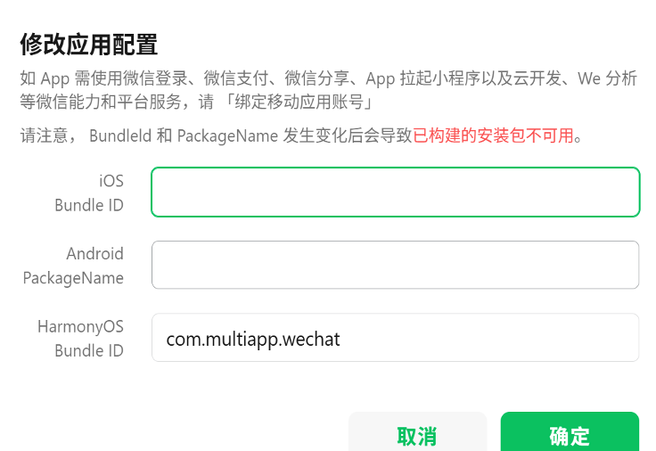 - 如你当前的多端应用已绑定移动应用账号,那么你需要前往【微信开放平台 - 管理中心 - 移动应用 - 开发信息】中配置鸿蒙的包名信息(注意,移动应用需审核通过)
