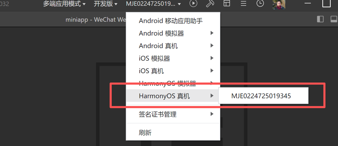 前往工具栏,在「设备选择栏」下拉选择刷新,查看「HarmonyOS真机」是否有新的设备 id 信息,选择连接上的 HarmonyOS 设备。