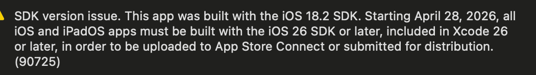 # 10、iOS 提交审核后出现提示:This app was built with the iOs 18.2 SDK. Starting April 28, 2026, all iOS and iPadOS apps must be built with the iOs 26 SDK or later, included in Xcode 26 or later, in order to be uploaded to App Store Connect or submitted for distribution.