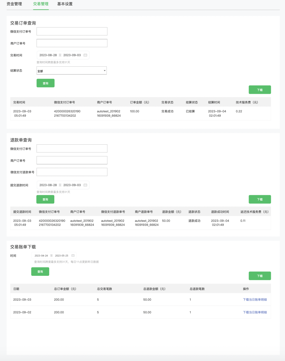 平台后台页面,提供交易查询、退款查询、以及下载账单能力。