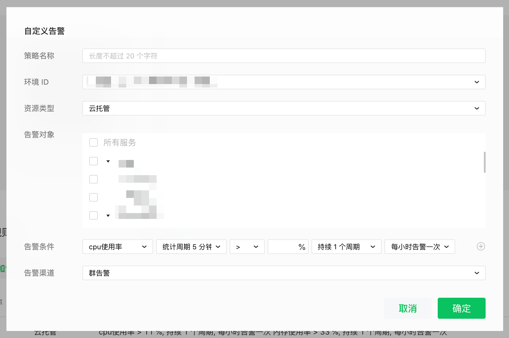 - 资源类型:目前仅支持对容器服务配置自定义告警
