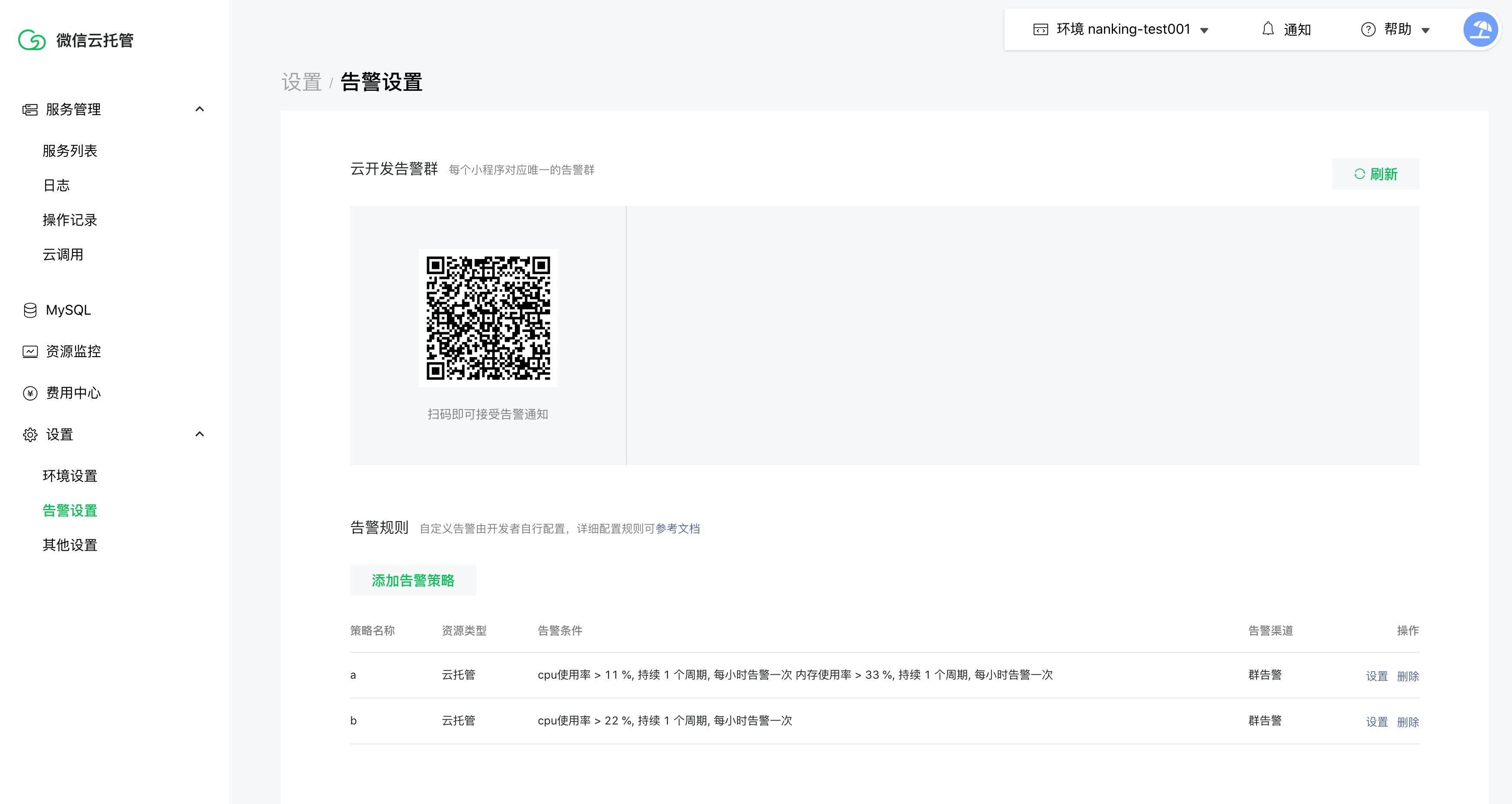 开发者可以通过微信云托管控制台-设置-告警设置中配置告警策略。每个环境最多可配置 50 条告警策略,每个告警策略中最多可添加 10 个告警条件。