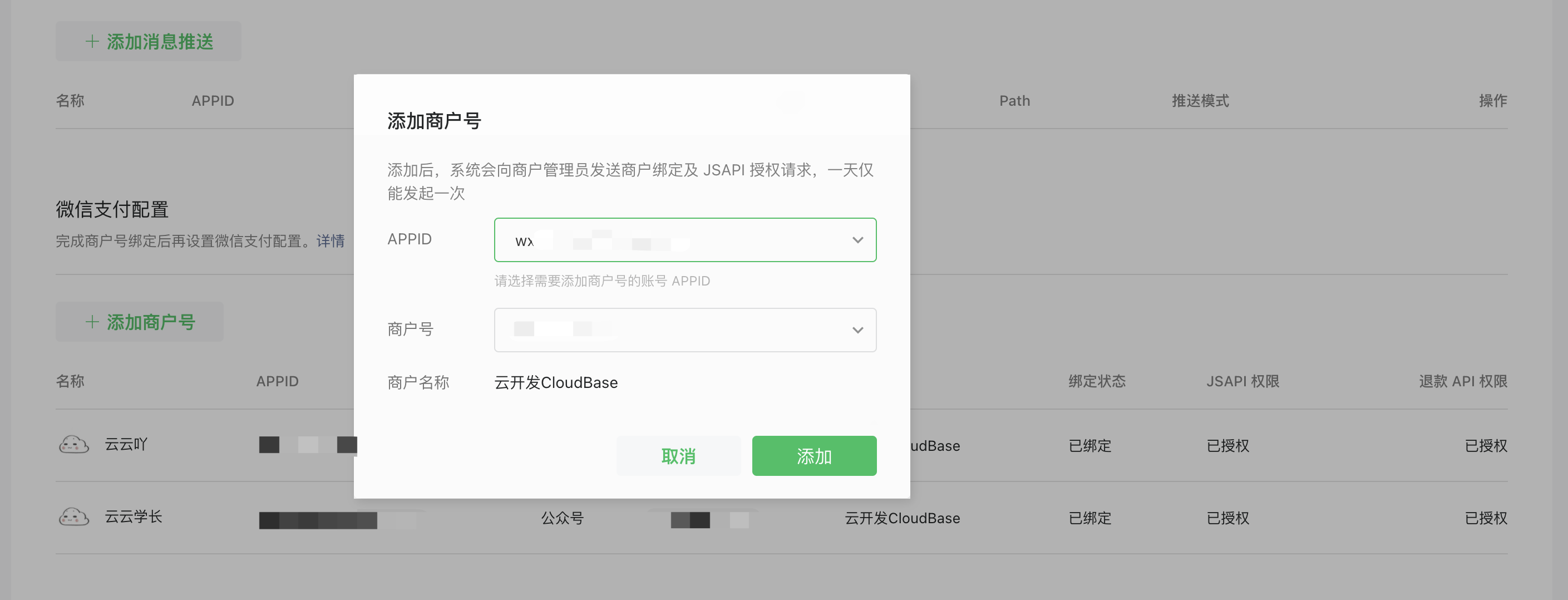 如果你小程序有多个环境,只需要在其中一个环境里操作上述绑定过程即可,此绑定关系是支付和小程序的,而不是云托管环境。