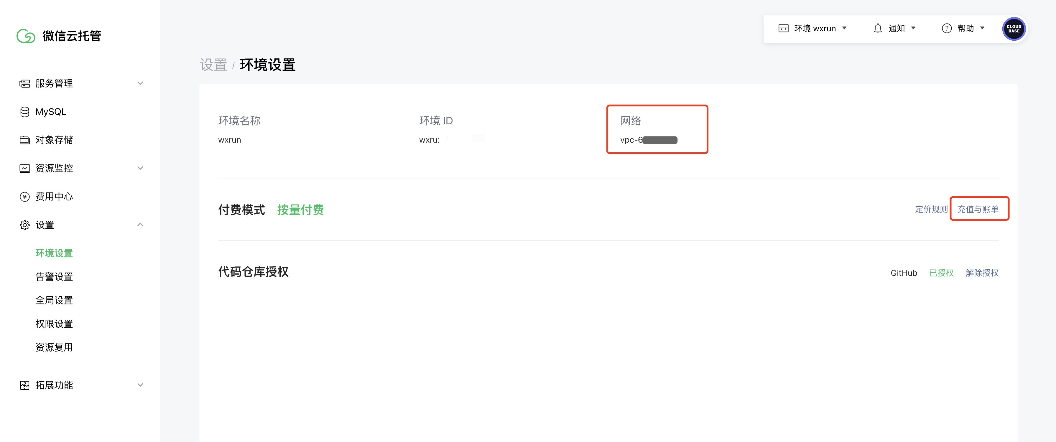 通过访问微信控制台设置-环境设置,可以看到当前环境的所在的VPC名称,点击「充值与账单」按钮,可以进入微信云托管环境所在的腾讯云账号。