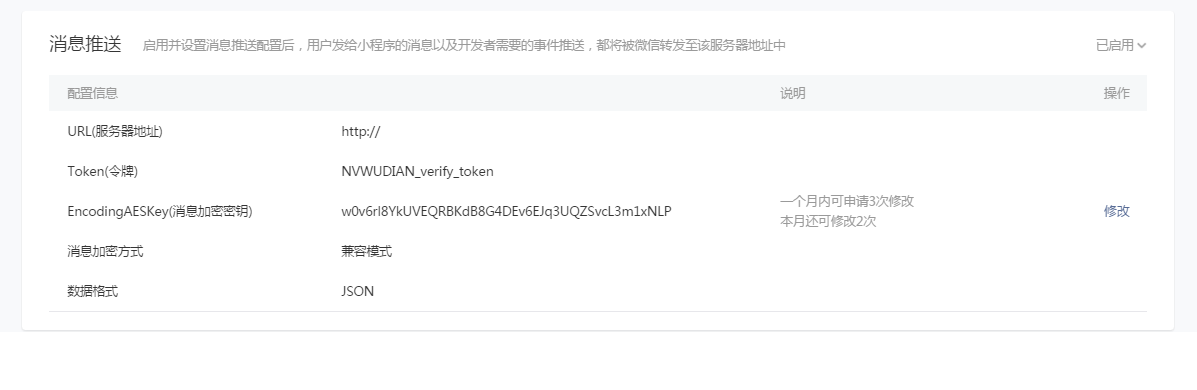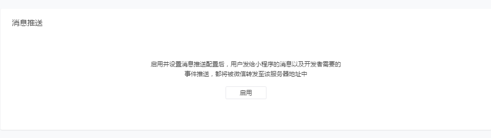 登录小程序,在“设置-开发设置-消息推送”启用消息推送功能并完成相关信息配置(包括服务器地址、Token、及加密方式等)。