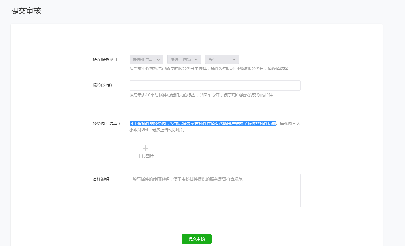 提交审核时,插件开发者需要填写以下信息:插件服务类目、标签、预览图及功能描述。