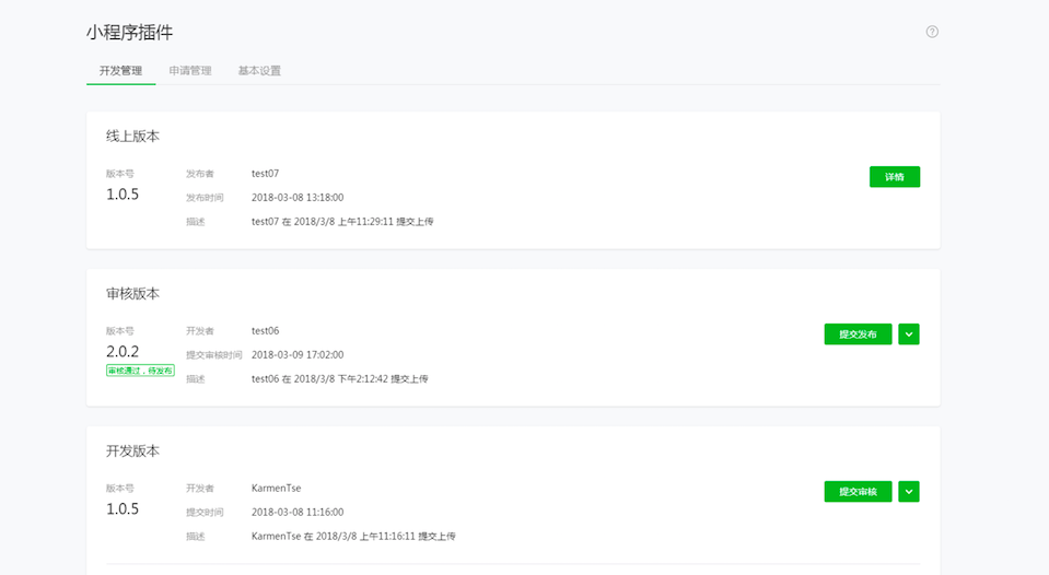 插件发布前需要提交微信小程序团队审核,审核通过后才可发布。