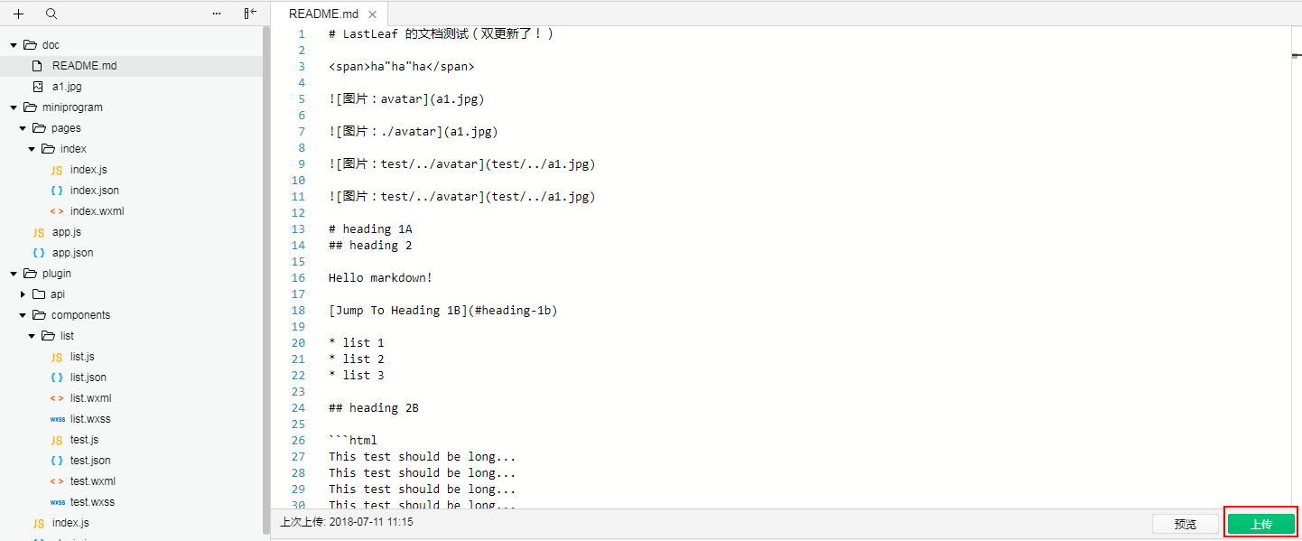 - 2.上传: 编辑 `README.md` 之后,可以使用开发者工具预览插件文档和单独上传插件文档。上传入口位置:README.md文档右下角