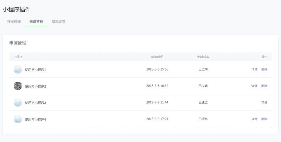 开发者可在”小程序管理后台-小程序插件-申请管理“内处理插件的接入申请。插件开发者可在24小时内选择”通过“或”拒绝“申请方使用插件。
