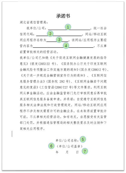 | 1. 填写单位名称、经营范围涉及的金融相关关键词。 2. 描述小程序主要运营内容,应描述具体且有实际意义。 3. 请手抄如下内容(手写正楷字体):以上承诺如有违反,愿接受电信主管部门的依法处理,并承担一切法律责任。 4. 加盖单位公章(不接受合同章、项目章等)。 5. 单位法定代表人签名(需手写正楷签名,接受签名章,不接受连笔签)。 6. 填写日期应与提交备案日期一致,或小于1个月。 |